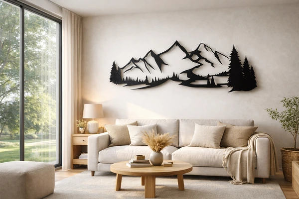 Metalowa dekoracja ścienna góry w aranżacji wnętrz